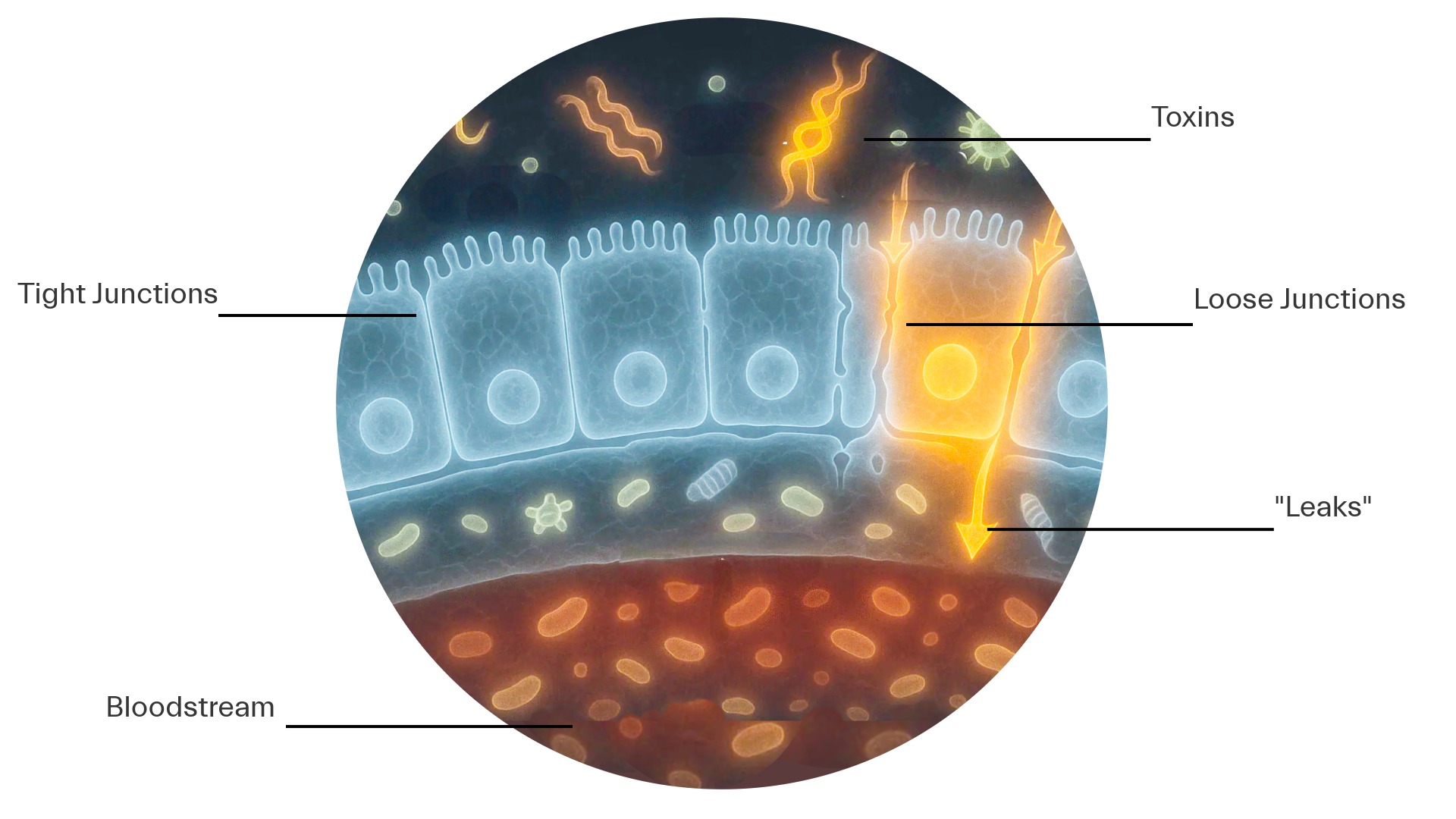 Tight junctions are tiny structures that connect the cells lining the gut and act as selective “gatekeepers,” deciding what can pass through the intestinal wall and enter the bloodstream. When these junctions work properly, they help maintain a strong, healthy gut barrier.