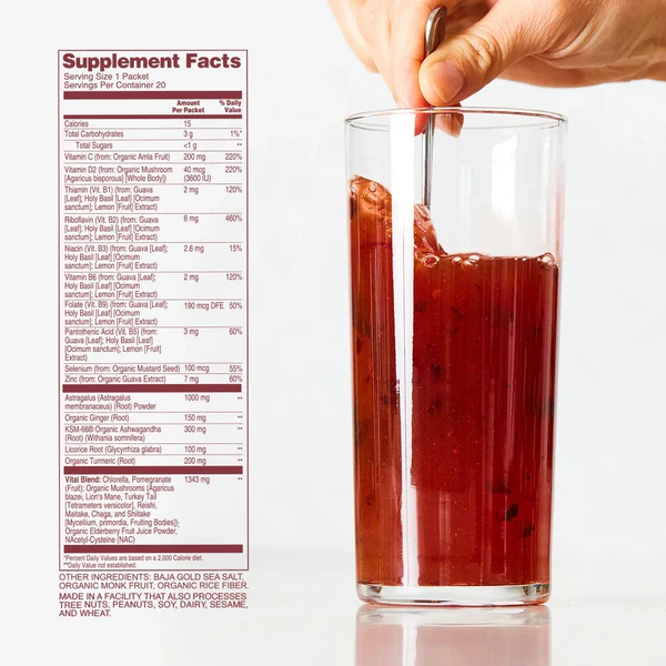 *Ginger, *Turmeric, Vitamin D2, Astragalus, *KSM-66® Ashwagandha, NAC (N-Acetyl Cysteine), *Immune Mushroom Blend (Agaricus Blazei, Lion’s Mane, Turkey Tail, Reishi, Maitake, Chaga, Shiitake), *Amla (50% Vitamin C), *Elderberry Juice, Licorice Root, Guava Leaf Extract, Holy Basil, Lemon Extract, *Monk Fruit Powder, Baja Gold Salt, *Mustard Seed, Chlorella, Pomegranate, *Rice Fibre